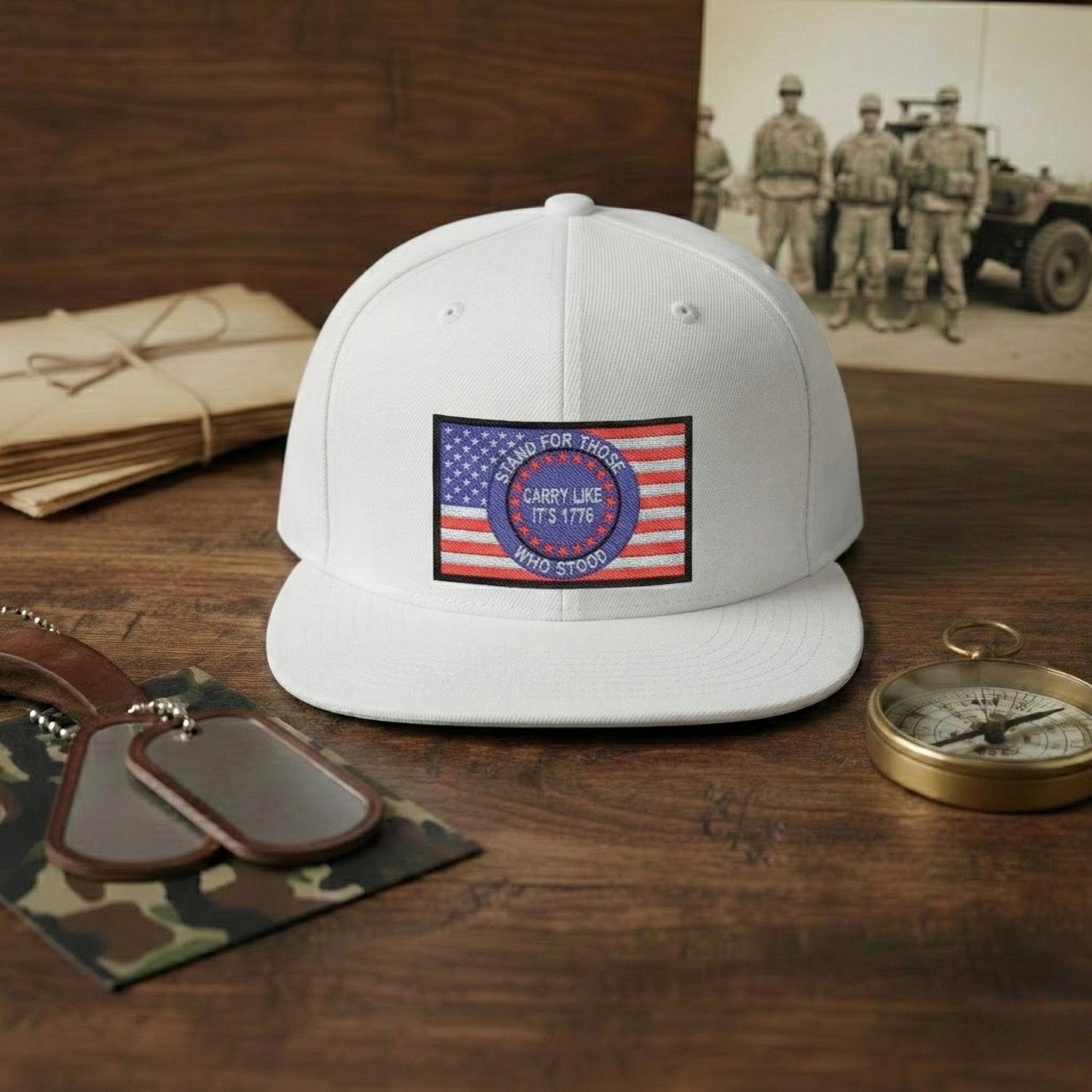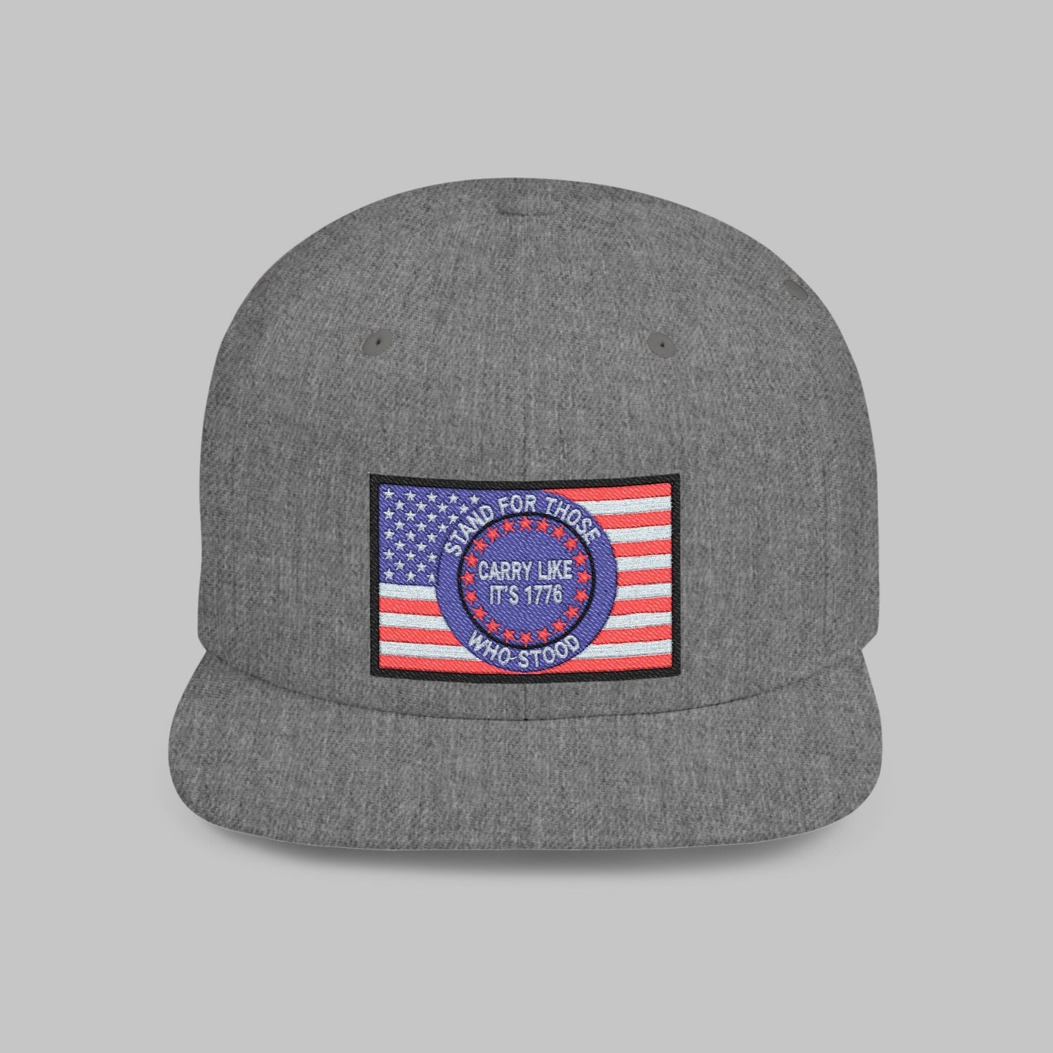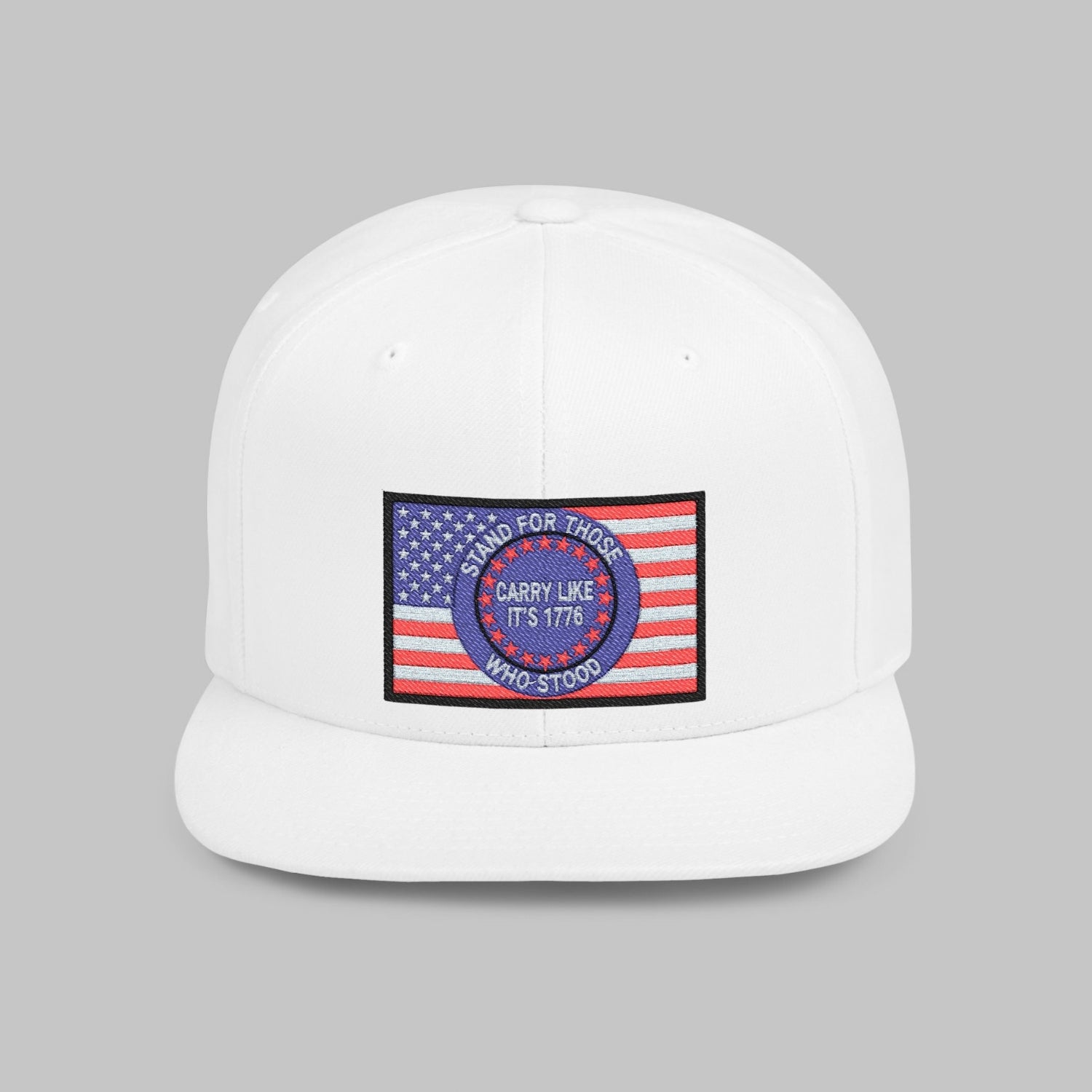 The Carry Like It’s 1776 snapback cap is a tribute to those who stood first—and those who still stand today. The embroidered rectangular patch features a bold American flag backdrop with a circular emblem reading “Stand for Those Who Stood — Carry Like It’s 1776.” It’s a reminder that freedom wasn’t handed down quietly—it was carried, defended, and earned.