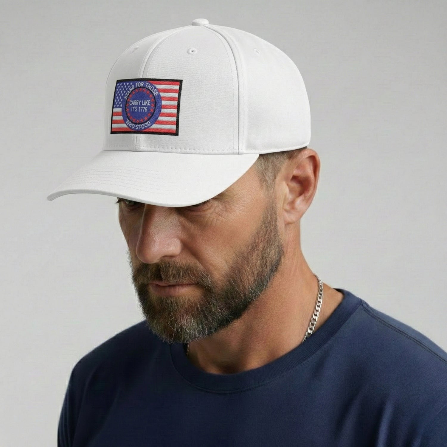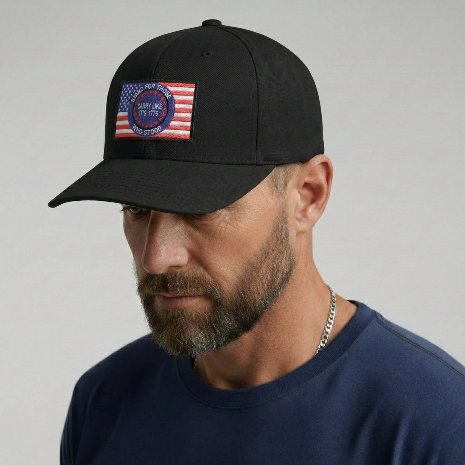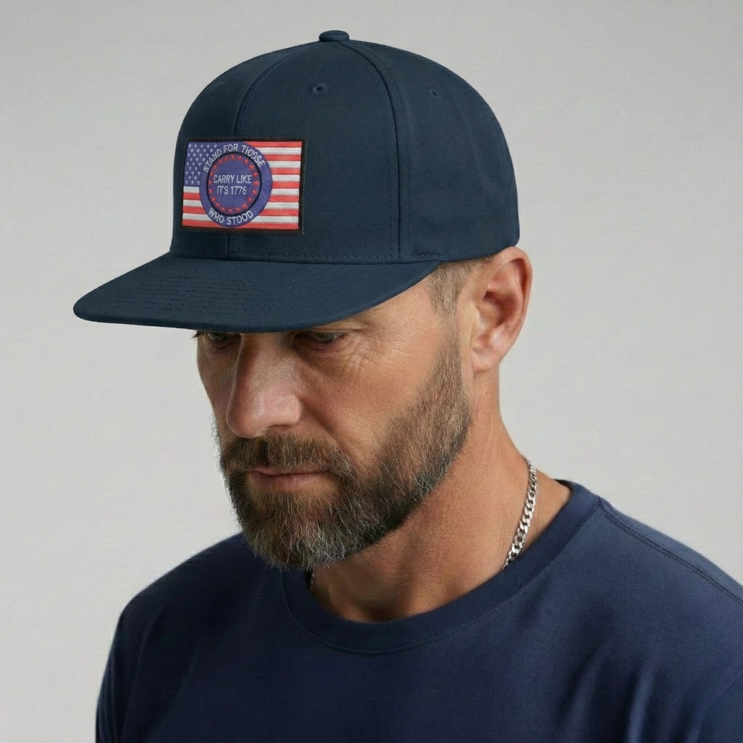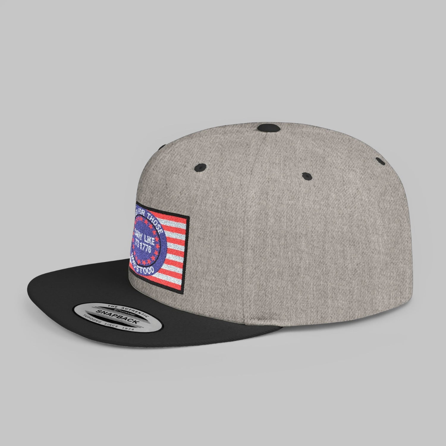 The Carry Like It’s 1776 snapback cap is a tribute to those who stood first—and those who still stand today. The embroidered rectangular patch features a bold American flag backdrop with a circular emblem reading “Stand for Those Who Stood — Carry Like It’s 1776.” It’s a reminder that freedom wasn’t handed down quietly—it was carried, defended, and earned.
