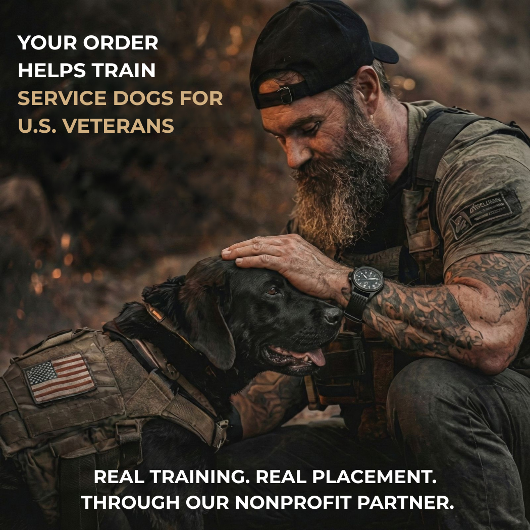 50% of every purchase supports verified service dog training programs for U.S. veterans.